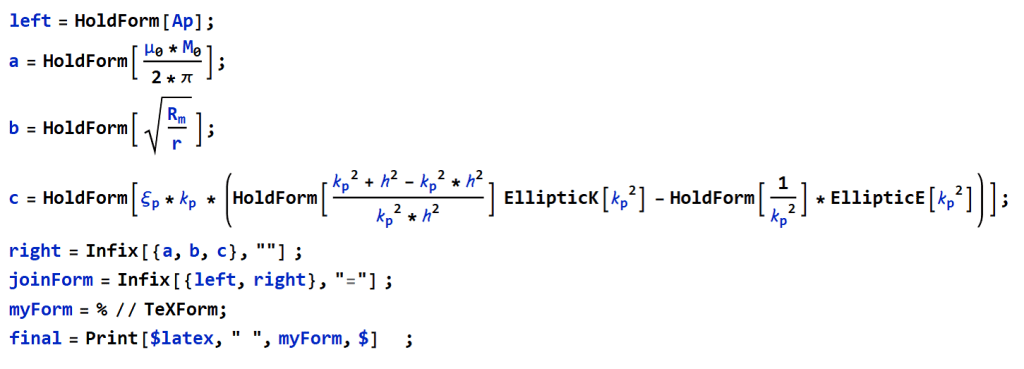 LaTex From Mathematica’s To WordPress (Upgrade) On 06/13/202106/19/2021 由predliu撰寫In Mathematica 若第一列是你的方程式,使用 MMA 轉TeXForm時,他內部會做簡化動作,會依第二列的結果,做出 LaTex ,如果你很龜毛硬要得到第三列,原汁原味,可以這樣做 分段一直用HoldForm 並用 Infix 結合 ,,完工. 分享此文: 按一下即可分享至 X(在新視窗中開啟) X 更多 按一下以分享至 Facebook(在新視窗中開啟) Facebook 喜歡 正在載入...