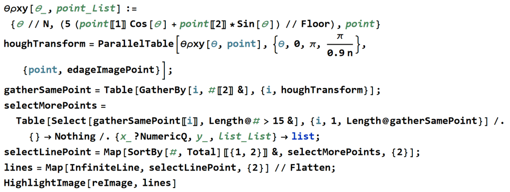 使用ParallelTable指令做影像處理的平行運算, 每個點做houghTransform ,gatherSamePoint收集相同的值.