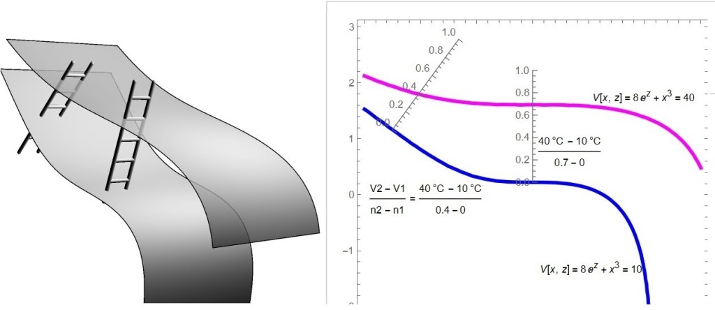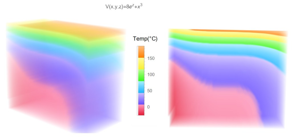 課本講了很多次,我猜應該是指V(x,y,z)為常數吧,考古一下,用電腦畫一下圖,應該是如下看圖說故事,當用電腦鎖定V(x,y,z)為定值常數,會得到一個同温層/等位面 .温度依我的亂掰函數向上增加.