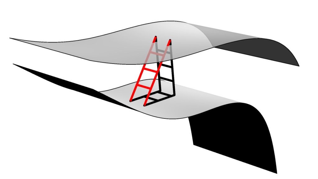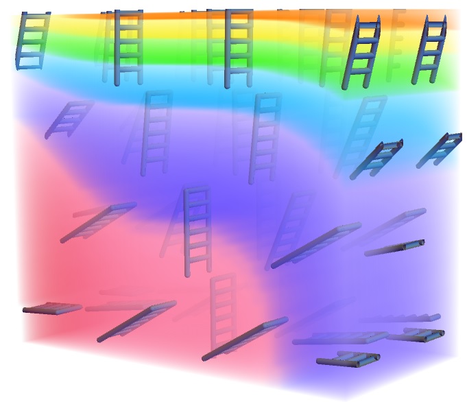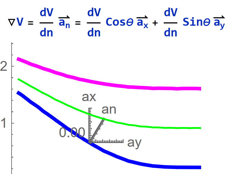在場V(x,y,z)裡,把長度為n的梯子擺在你要的位置,且梯子要垂直於這位置的等位面V(x,y,z)為定值,爬梯子到鄰近的點,測量他的物理量相減得dV,的比值(dV/dn)及梯子插的方位(an)
