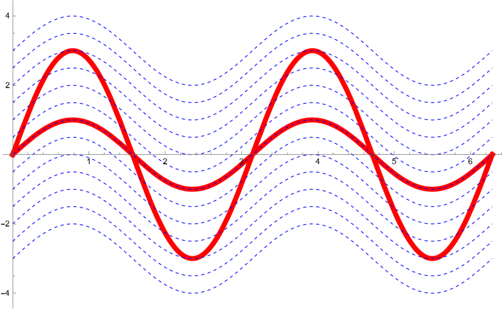 等距離面跟同温層/等距面各有不同.下圖虛線是這個亂掰函數平行藍色的等距離面(Offset Surface).