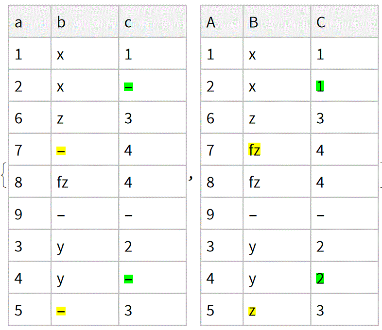 <|"a" -> 9, “b" -> “-“, “c" -> “-“|>,